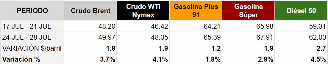 Promedio semanal de los precios de los combustibles en el mercado internacional del 24 al 28 de julio de 2017