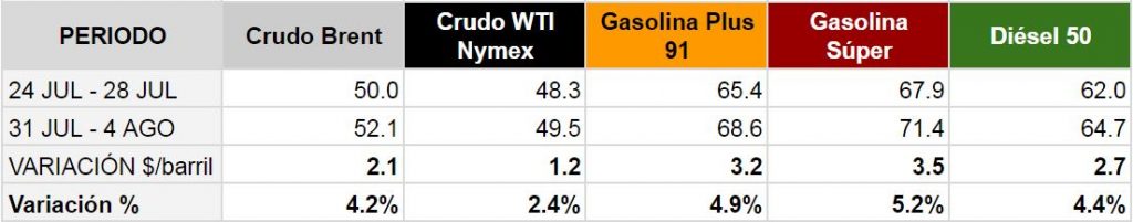 Promedio semanal de los precios de los combustibles en el mercado internacional del 31 de julio al 4 de agosto de 2017