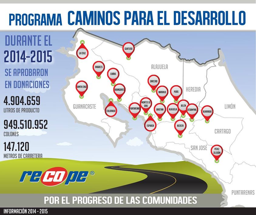 Lo entregado a las municipalidades por donaciones de asfalto y emulsión asfáltica, de enero a noviembre del 2015 suma un total de 2,395.995 litros, un equivalente a ₡480,8 millones. Con esta cantidad se cubre con sello asfáltico, una longitud mayor a los 81,4kilómetros de caminos vecinales en el 2015.