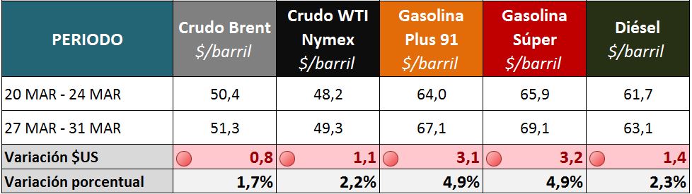 Promedio semanal de los precios de los combustibles en el mercado internacional Del 27 al 31 de marzo de 2017
