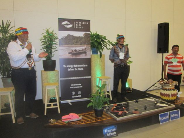 MANAUS, Brasil,  (IPS). Los indígenas Milton Callera (con micrófono) y Nantu Canelos, del pueblo achuar, explican cómo funcionan los dos barcos solares construidos para el transporte de su pueblo en los ríos amazónicos de Ecuador. El proyecto es de la Fundación Kara Solar, que impulsa una alianza para «solarizar» el transporte fluvial en la Amazonia. Crédito: Mario Osava/IPS. Una gran rueda de acero, de 14 metros de diámetro y 1,3 metros de ancho, puede ser la solución energética del futuro cercano, al generar 3,5 megavatios de forma permanente, suficiente para abastecer a una ciudad de 30.000 habitantes, según se expuso en la capital amazónica de Brasil. Un fluido interno, que se expande por una reacción química en contacto con una tinta, impulsa la rotación que produce la electricidad sin interrupción por al menos cinco años, aseguran ejecutivos de Eletro Roda, una empresa de esta ciudad de Manaus que comercializa el invento y está construyendo su primera unidad de demostración. “Su instalación cuesta menos de la mitad que una central solar equivalente y ocupa un área de solo 200 metros cuadrados, contra 50.000 metros cuadrados de la solar y 5.000 de la eólica”, comparó a IPS el director y socio de la empresa, Fernando Lindoso. Es decir, en el área de una central eólica con potencia de 3,5 megavatios (MW) se podrían instalar 25 electro-ruedas, multiplicando por 25 la capacidad generadora. Además con la ventaja de una generación estable, “sin la intermitencia de otras fuentes”, acotó Lindoso, quien estimó en cerca de cinco millones de dólares el costo de cada unidad de 3,5 MW, un precio que se reduce para proyectos sociales. Hay interesados en Japón, India, otros países asiáticos, europeos y de Medio Oriente, con base en prototipos anteriores que no llegaron a ser comerciados, informó. Habrá una versión menor, de un MW, “30 por ciento más barata”, de dimensiones idénticas, pero con tres toneladas del fluido que es biodegradable, en lugar de las cuatro del otro modelo. Esa fue una de las alternativas presentadas en la Feria y Simposio de Soluciones Energéticas para Comunidades de la Amazonia, que reunió entre el 25 y el 28 de marzo a más de 500 participantes y 39 empresas e instituciones expositoras en Manaus, la capital del estado de Amazonas, en el noroeste de Brasil. “Mi preferido es el barco solar, un buen ejemplo de cómo buscar soluciones”, comentó Sam Passmore, director del Programa Ambiental de la estadounidense Fundación Charles Stewart Mott, una de las ocho patrocinadoras internacionales del encuentro.