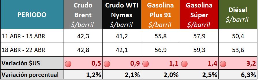 Promedio semanal de los precios de los combustibles en el mercado internacional Del 18 al 22 de abril de 2016