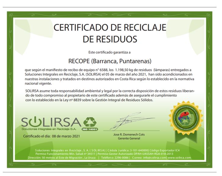 Como parte de los proyectos de ahorro energético y cuidado del ambiente, desde el 2012,  la empresa ha propiciado la instalación de lámparas con fuente de energía solar, incluyendo las instalaciones de la empresa en: Moín, Turrialba, Siquirres, El Alto, B-line y los Aeropuertos Limón, Tobías Bolaños, Juan Santamaría,  lo que ha permitido mantener una producción  auto suficiente de 27 400 watts por medio de 137 luminarias instaladas.