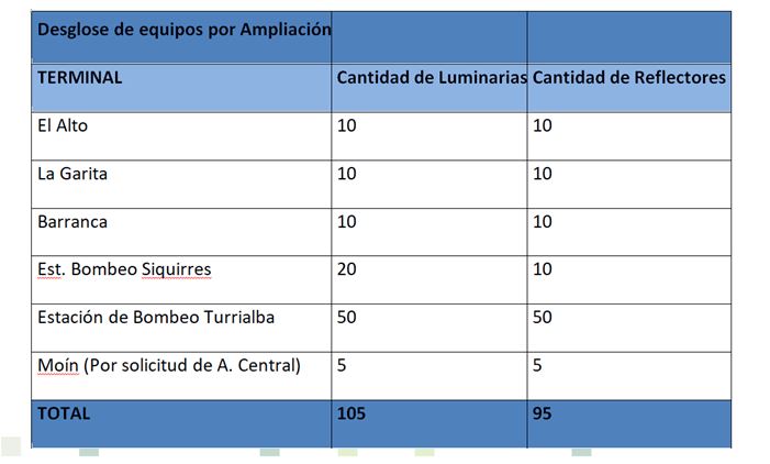 Además en el 2020 se instalaron  120 reflectores de 300 watts en tecnología LED, que  reemplazaron reflectores antiguos utilizados en el alumbrado público, que consumían entre 1000 a 1500 watts.  La ubicación de estos reflectores estuvo a cargo del Contratista Ecological Solucions,  y abarcaron las terminales El Alto, La Garita y Barranca.