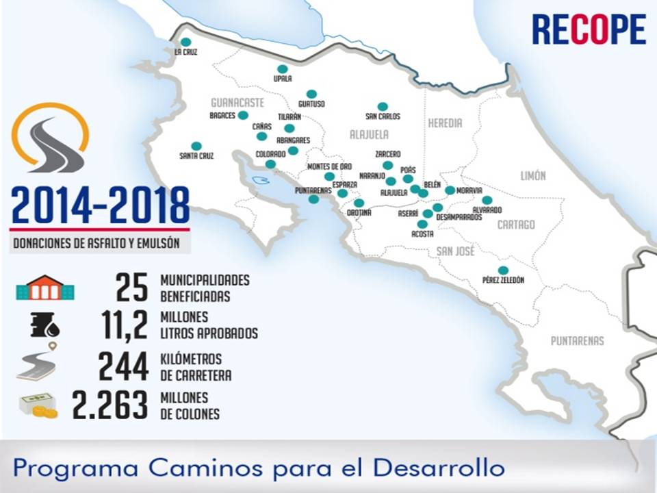El programa «Caminos para el desarrollo» se estructuró en la presente administración con la aprobación de procedimientos, que incluyeron la guía por parte del Departamento de Ingeniería de RECOPE, con el propósito de que estos recursos sean aprovechados de la mejor manera posible, asegurando la durabilidad de los pavimentos.