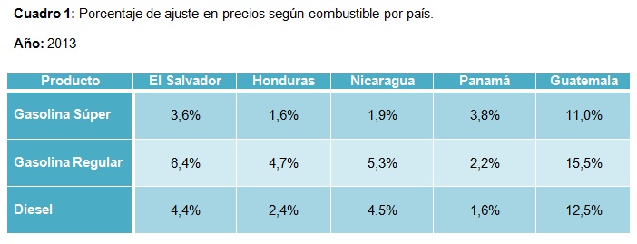 En el resto de los países del istmo se hacen ajustes semanales o quincenales en el precio de los combustibles, en tanto que en Costa Rica,  éstos se realizan solo una vez al mes, por lo cual, este desfase también  introduce problemas en la comparabilidad, aspecto que se subsana en este artículo, analizando los precios promedio en el año 2013, con lo cual se logran compensar las alzas y bajas en los precios ocurridas a lo largo de ese año.