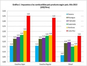 Dado que las comparaciones de precio se efectúan incluyendo los impuestos, éstos constituyen otro factor que distorsiona los cotejos. Costa Rica tiene los impuestos más altos a los combustibles del istmo centroamericano (ver gráfico 1), aspecto que analicé para el periodo 2003 al 2013 en un artículo anterior.En contraste, Panamá tiene el monto más bajo, en comparación con el de Panamá, el de Costa Rica es 2.9 veces mayor para la gasolina súper, 2.7 veces para la regular  y 3.9 veces para el diésel.