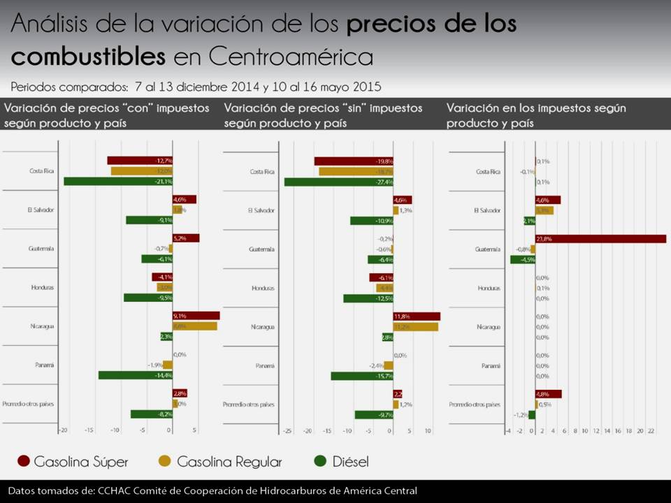 En promedio en el resto del los países la gasolina Súper aumentó un 2,8%, mientras las bajas se quedaron para el diésel con un 8,2%; las mayores disminuciones, después de Costa Rica, se dieron en El Salvador con un 9% y Panamá con un 14,4%.