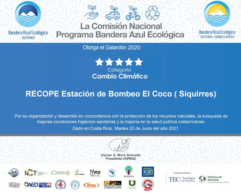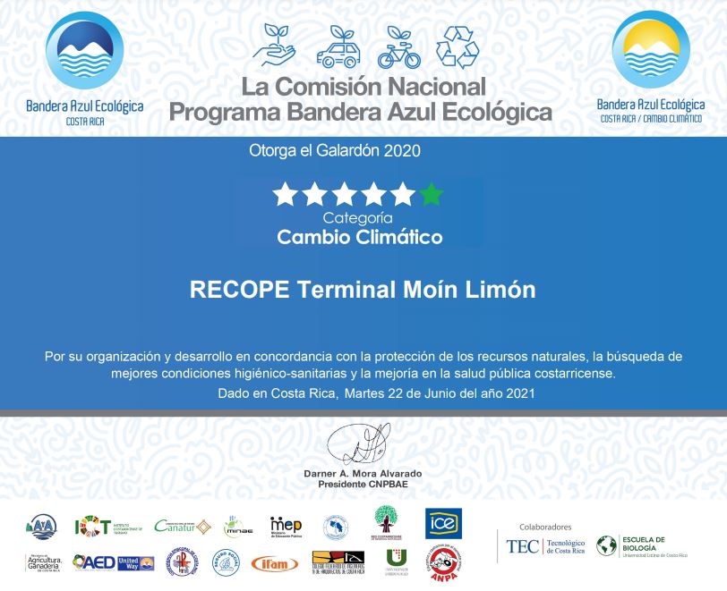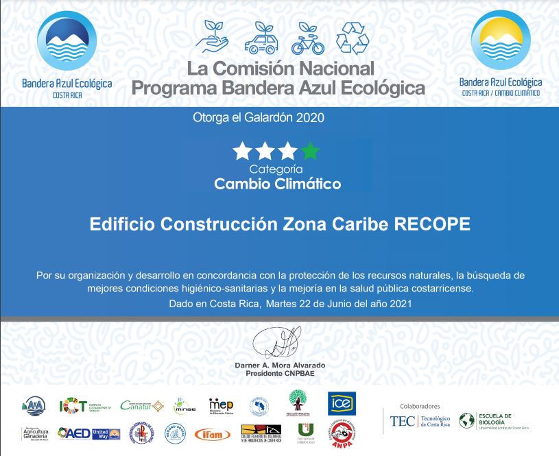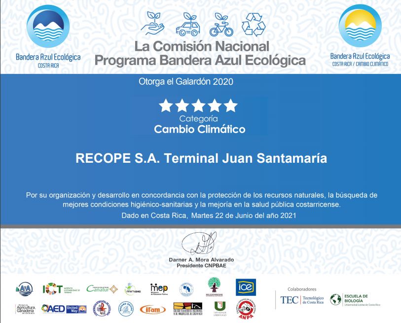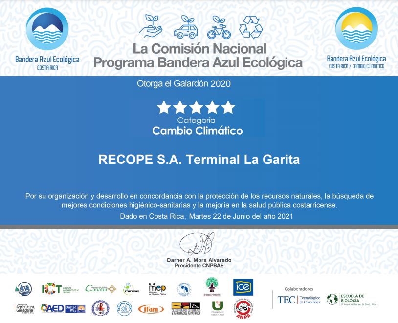 - RECOPE se convierte en una de las pocas empresas de naturaleza petroquímica galardonada con la Bandera Azul Ecológica en la Categoría Cambio Climático para todos sus edificios y terminales.