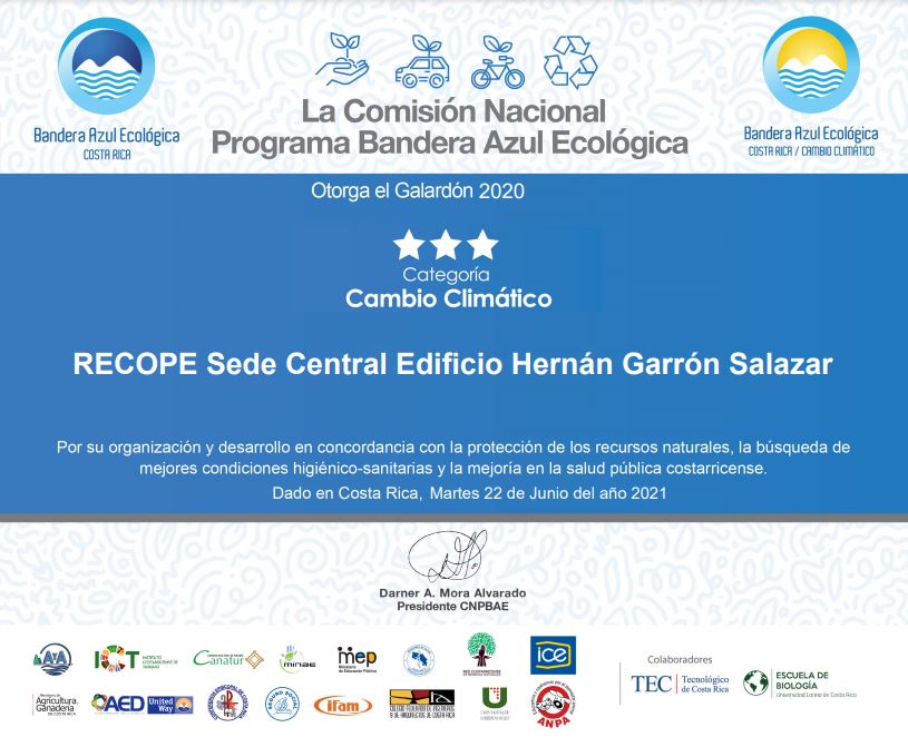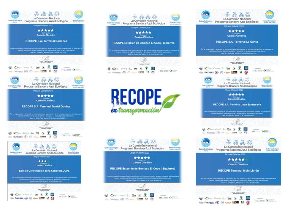 - RECOPE se convierte en una de las pocas empresas de naturaleza petroquímica galardonada con la Bandera Azul Ecológica en la Categoría Cambio Climático para todos sus edificios y terminales.