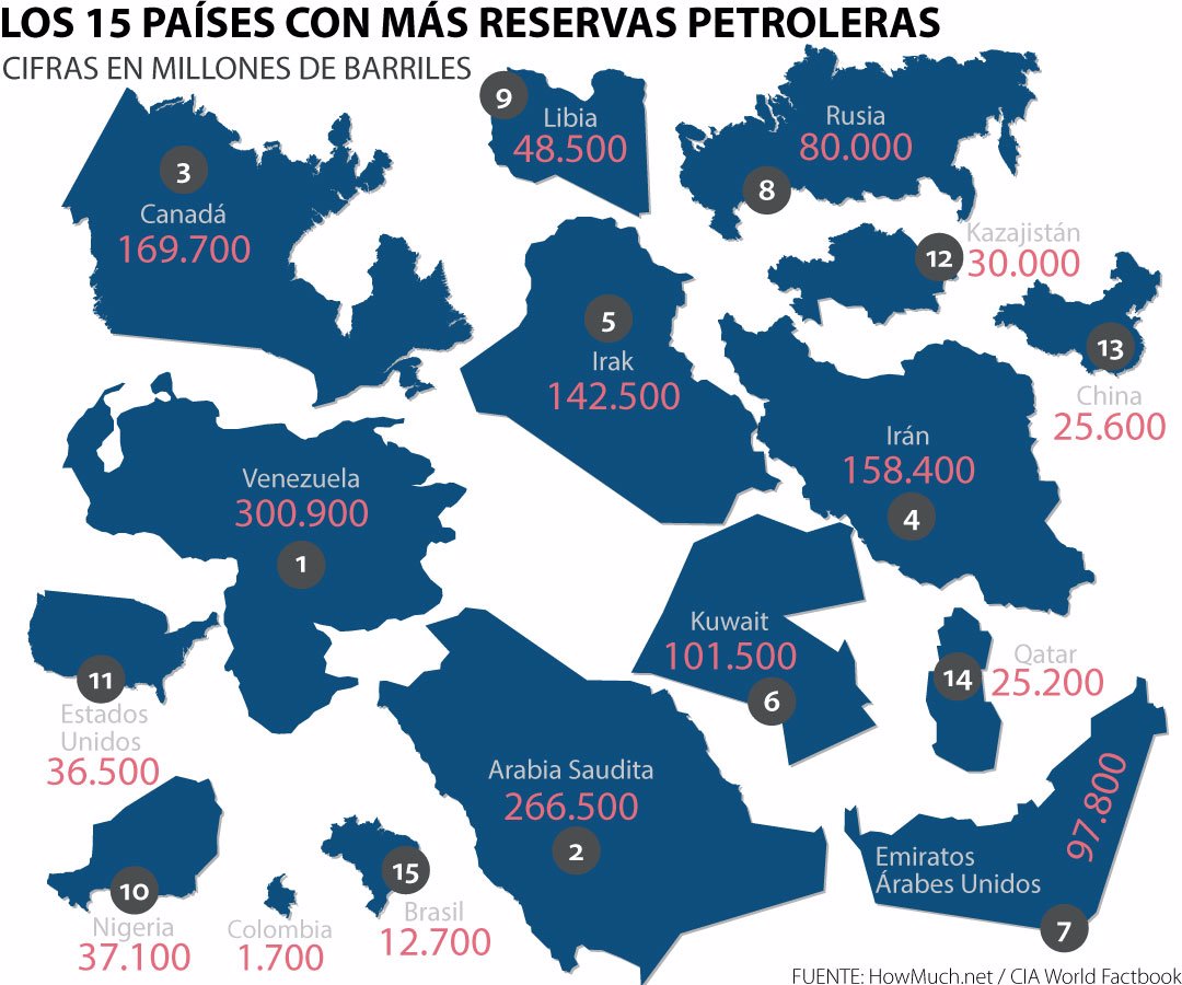 Mucho se ha hablado de cuál es el país que tiene las mayores reservas de petróleo y paradójicamente el ganador de ese título es hoy en día una de las naciones con el mayor nivel de pobreza en el mundo y una hiperinflación que golpea la calidad de vida de sus ciudadanos: Venezuela. El país vecino registra 300.900 millones de barriles de petróleo, seguido de Arabia Saudita (266.500 millones de barriles) y Canadá (169.700 millones de barriles). Incorporamos a Colombia (aunque no está dentro del top 15) para tener una referencia. Sus reservas son de 1.700 millones de barriles.