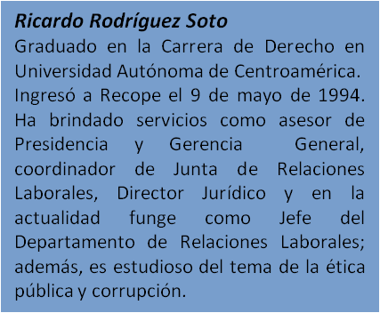 RECOPE cuenta con un Código de Ética y un programa de gestión de la Ética que involucra a las áreas de Recursos Humanos, Comunicación, Suministros, Control Interno, Contraloría de Servicios y Planificación, bajo la coordinación de la Gerencia General. El siguiente artículo, cuyo contenido se enfoca en establecer el antagonismo entre ética y corrupción, ayuda a reflexionar sobre cuál es la fundamentación de incorporar esta temática a la gestión pública.