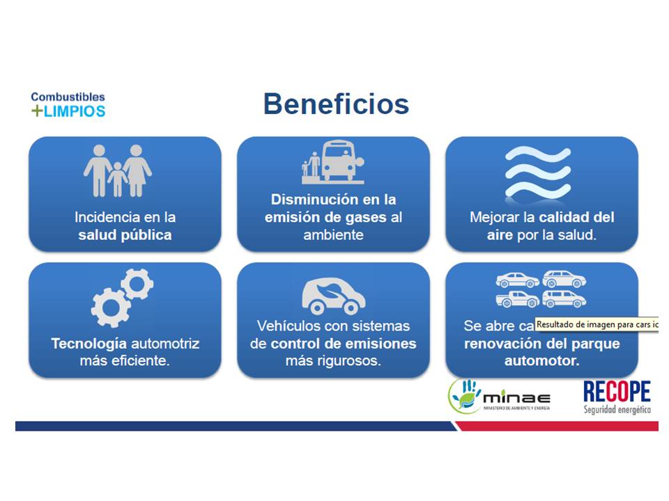 «Con la actualización de la calidad de los combustibles se cumple una meta más del VII Plan Nacional de Energía, que pretende mejorar la calidad del aire, mediante el uso de combustibles más limpios que facilitan la incorporación de tecnologías automotrices más eficientes y menos contaminantes. Este es un paso más en el camino hacia la renovación del parque automotor y un modelo de desarrollo bajo en emisiones”,indicó la viceministra Irene Cañas.