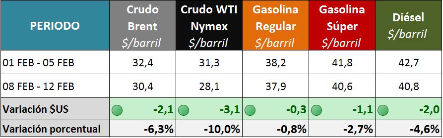 Promedio semanal de los precios de los combustibles en el mercado internacional Del 08 al 12 de febrero de 2016