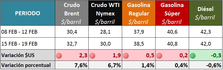 Promedio semanal de los precios de los combustibles en el mercado internacional Del 15 al 19 de febrero de 2016