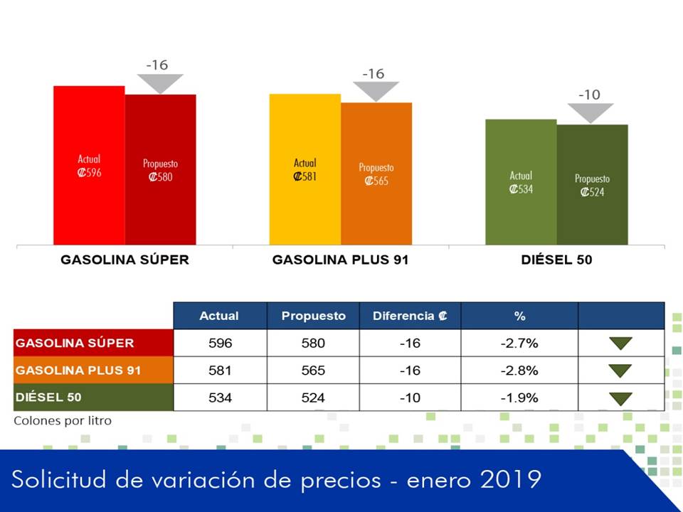 RECOPE presentó este viernes 11 de enero ante la Autoridad Reguladora de los Servicios Públicos (ARESEP), el estudio extraordinario para el ajuste en el precio de los combustibles de enero 2019, por variaciones del mercado internacional y el tipo de cambio, cuyo efecto entraría a regir en el próximo mes de febrero.