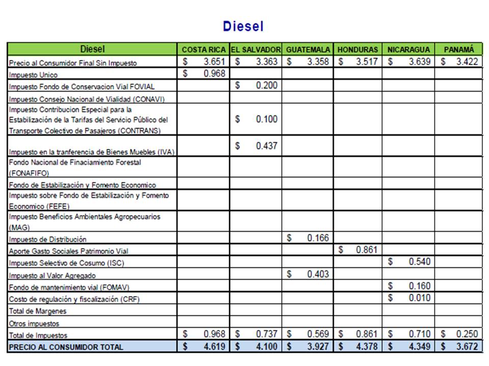 El diésel es el más caro de la región pero se debe a la calidad del mismo, ya que  el contenido máximo de azufre del diesel que se consume en Costa Rica es de 50 ppm. En Guatemala se consume diesel desde 50 ppm hasta 5000 ppm, en Panamá la cantidad máxima de azufre en el diesel es de 500 ppm y del resto de naciones del Istmo no se tiene información actualizada.