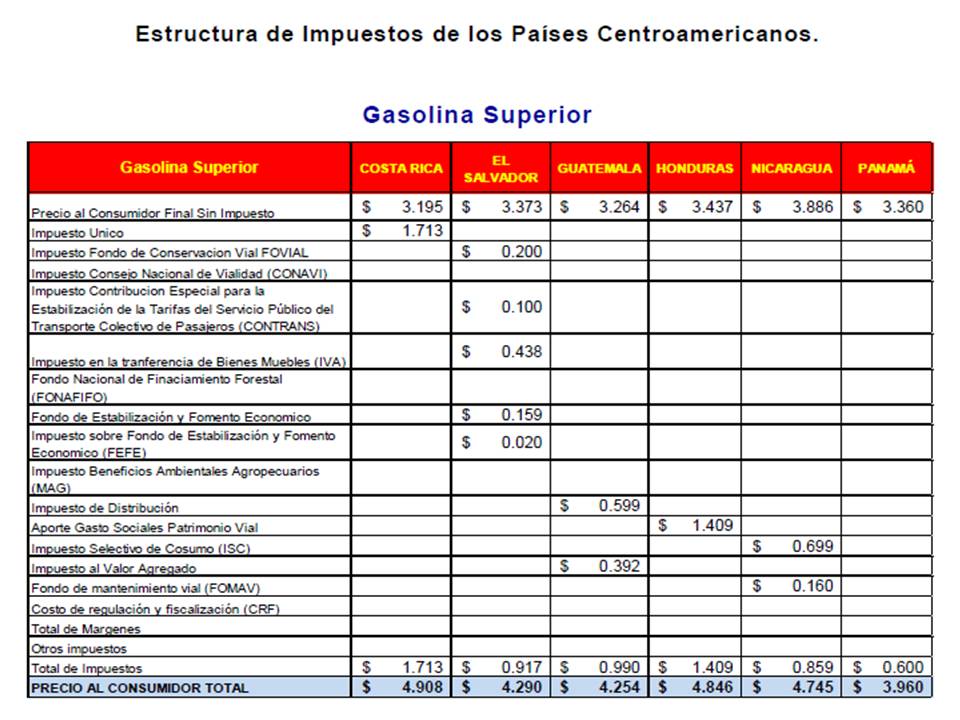 El precio de las gasolinas en Costa Rica sin contar la carga impositiva que pesa sobre ellas, es el más barato de Centro América y Panamá, de acuerdo con los resultados del último informe del Comité de Cooperación en Hidrocarburos de América Central (CCHAC).
