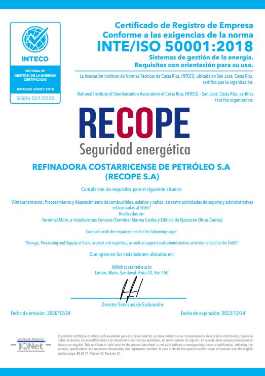 El Instituto de Normas Técnicas de Costa Rica (INTECO) ha certificado el Sistema de Gestión de Energía (SGEn) de RECOPE conforme a las exigencias de la norma INTE/ISO 50001:2018.