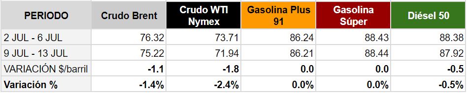 Promedio semanal de los precios de los combustibles en el mercado internacional Del 09 al 13 de julio de 2018