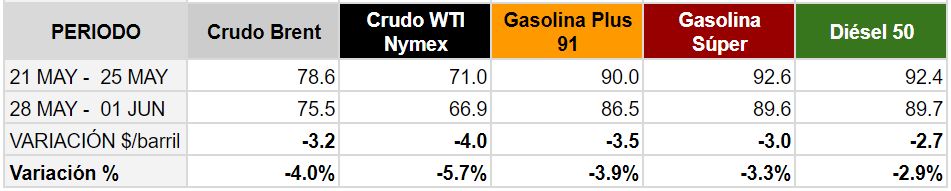 Promedio semanal de los precios de los combustibles en el mercado internacional Del 28 de mayo al 01 de junio de 2018