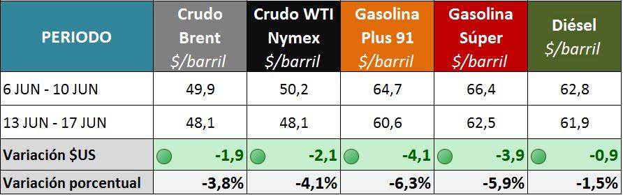 Promedio semanal de los precios de los combustibles en el mercado internacional Del 13 al 17 de junio de 2016