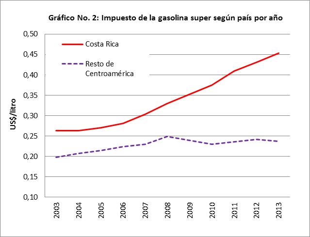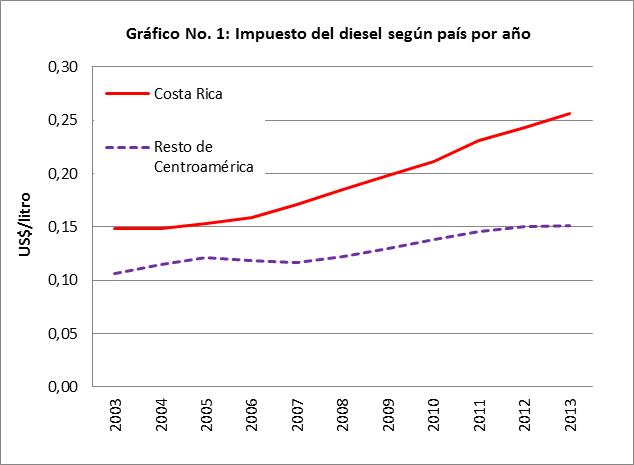Gráfico No. 1: Impuesto del diesel según país por año El gráfico No. 1 muestra la evolución del impuesto en el diésel, nótese el mayor crecimiento de éste para Costa Rica en contraste con el resto del istmo. En la década en consideración, ese impuesto en Costa Rica aumentó un 72%, en tanto que en el resto del área, el incremento fue de apenas un 43%, tendiendo a estabilizarse en los últimos dos años. Mientras en el 2003 el impuesto en Costa Rica era un 40% mayor que los otros países, en el 2013 es un 70% más alto.