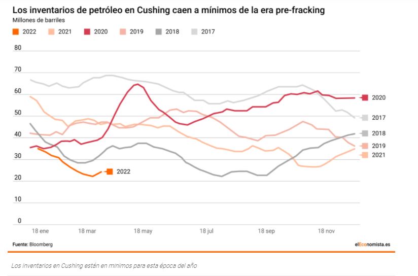 Los precios del petróleo vuelven a dispararse tras el alivio de la semana pasada. El rechazo creciente al petróleo ruso y la ausencia de alternativas en el muy corto plazo para sustituirlo están generando cierto pánico en los mercados. El foco vuelve a ponerse en los problemas de la oferta para suplir la demanda inmediata de crudo (mercado spot o físico), lo que está exacerbando la estructura de backwardation del mercado (se paga una prima por el petróleo físico frente a los futuros). Mientras tantos, los inventarios de petróleo crudo siguen cayendo y en Cushing (Oklahoma) han tocado niveles que no se veían desde que la industria del fracking y el shale oil irrumpieran en EEUU.El mercado se enfrenta a un difícil equilibrio y el bajo nivel de las reservas no ayuda para nada. Al final, las reservas o inventarios de crudo son una suerte de red que sirve para compensar los excesos de la demanda durante cierto tiempo. Cuando el mundo consume más petróleo del que se está produciendo, los inventarios caen para compensar ese desequilibrio, pero los inventarios no son finitos. Con los inventarios en mínimos de varios años, la red de protección ha perdido resistencia, por lo que la prima a la que cotiza el crudo es superior.Los inventarios de petróleo en Cushing son los más bajos desde que el fracking hizo su gran irrupción en EEUU allá por 2013 y 2014, según Bank of America Merrill Lynch (BofAML).El spread entre el petróleo ya extraído o spot y el crudo a futuro está alcanzando máximos de las últimas décadas (11,70 dólares de diferencia entre el futuro a un mes y el futuro a 3 meses). Esto es peligroso, según BofA, puesto que genera un desincentivo a mantener el petróleo en inventarios. Los comerciantes están vendiendo todo su petróleo porque le van a sacar un mayor rendimiento ahora que si lo almacenan y venden futuros.