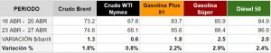Promedio semanal de los precios de los combustibles en el mercado internacional Del 23 al 27 de abril de 2018