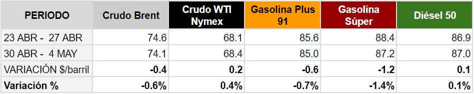 Promedio semanal de los precios de los combustibles en el mercado internacional Del 30 de abril al 04 de mayo de 2018