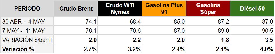 Promedio semanal de los precios de los combustibles en el mercado internacional Del 07 al 11 de mayo de 2018