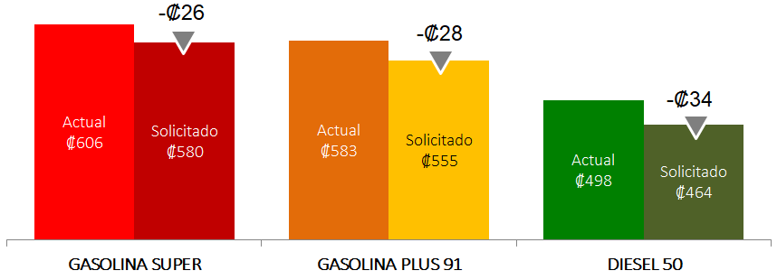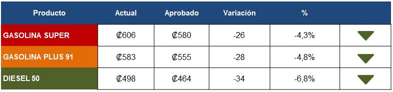La Gasolina Súper pasa de ₡606 por litro a ₡580 para una rebaja de ₡26. En la Gasolina Plus 91 la disminución es de ₡28, pasando de ₡583 a ₡555. El diésel pasa de ₡498 a ₡464 lo que representa un monto de ₡34 menos por litro.