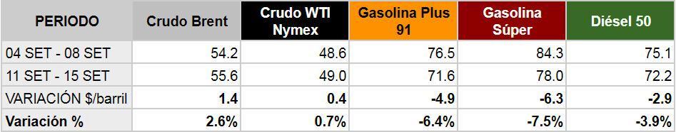 Promedio semanal de los precios de los combustibles en el mercado internacional Del 11 al 15 de septiembre de 2017