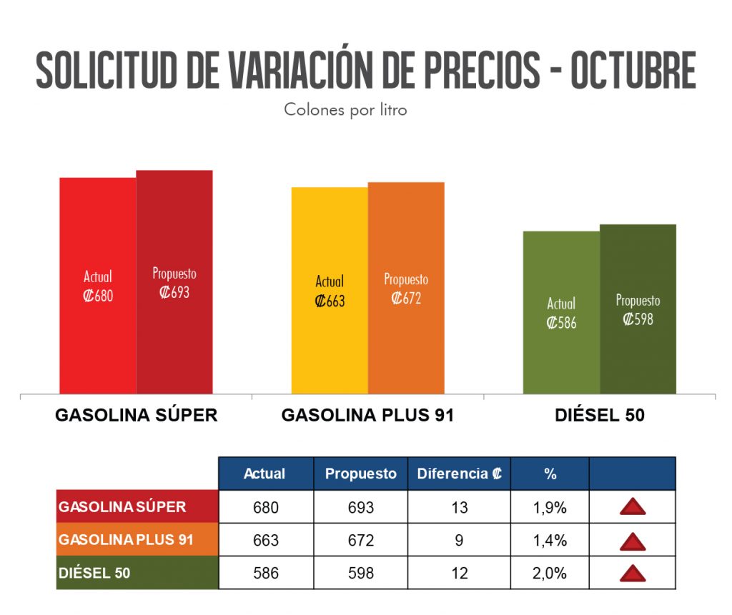 Por lo anterior las modificaciones en el precio al consumidor final serían las siguientes: la Gasolina Plus 91 aumentaría ₡ 9 por litro al pasar de ₡663 a ₡ 672 por litro, la Gasolina Súper se incrementaría ₡ 13 por litro a pasar de de ₡680 a ₡693, mientras que el litro de diésel pasaría de ₡586 a ₡598 para un aumento de ₡12.