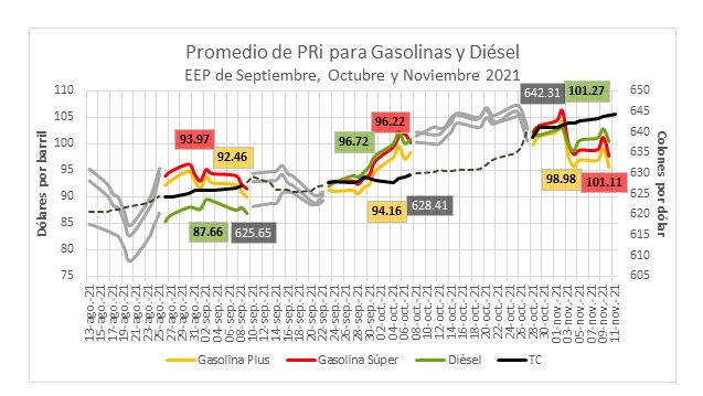 Según la metodología de precios vigente (RJD-230-2015), en la fijación extraordinaria se toman en cuenta los valores de cotizaciones internacionales de los combustibles y tipo de cambio de los últimos quince días. En el siguiente gráfico, puede observarse que en las semanas previas al EEP de noviembre los precios internacionales estuvieron más elevados, sin embargo, la tendencia del tipo de cambio respecto al dólar siguió su tendencia alcista.
