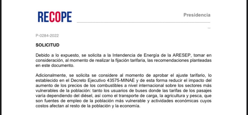 El presidente de RECOPE, Juan Manuel Quesada señaló que “es importante materializar estas acciones (la rebaja y la aplicación del decreto presidencial) para reducir el impacto de los aumentos y beneficiar a la población más vulnerable», por eso expresó: «Ojalá Aresep se ponga la mano en el corazón y resuelva rápidamente”.