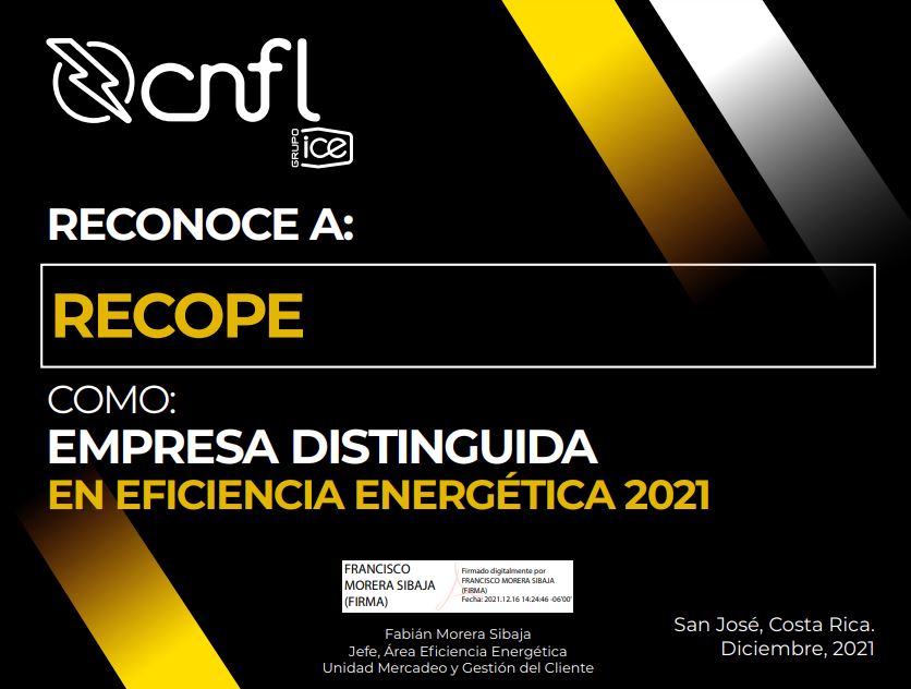Agradecemos su confianza al compartir con nosotros sus acciones en torno a la eficiencia energética, adjuntamos el certificado digital de Empresa Distinguida en eficiencia energética que pretende reconocer las acciones que sobre el tema que realiza RECOPE.