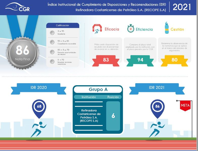 RECOPE ocupó el sexto puesto entre las instituciones mejor calificadas por la Contraloría General de la República (CGR) dentro del grupo A como se desprende de los resultados del “Índice Institucional de Cumplimiento de Disposiciones y Recomendaciones (IDR) 2021 donde RECOPE obtuvo una calificación de 86 puntos, luego de medir los factores de eficacia, eficiencia y gestión.