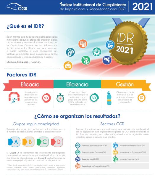 EL IDR es un instrumento que muestra una calificación a las instituciones según el grado de atención de las disposiciones y recomendaciones emitidas por la Contraloría General en sus informes de fiscalización en los últimos dos años anteriores a cada medición, el cual comprende tres factores primordiales en el cumplimiento de las disposiciones y recomendaciones, a saber: Eficacia, Eficiencia y Gestión.