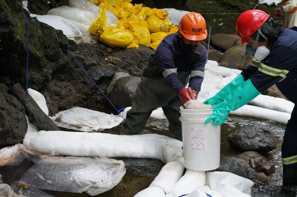 Personal de RECOPE se mantiene trabajando en el lugar conocido como Mata de Mora en el cantón de Oreamuno donde un derrame de combustible producto de una toma ilegal, ha afectado las aguas del Río Paéz.