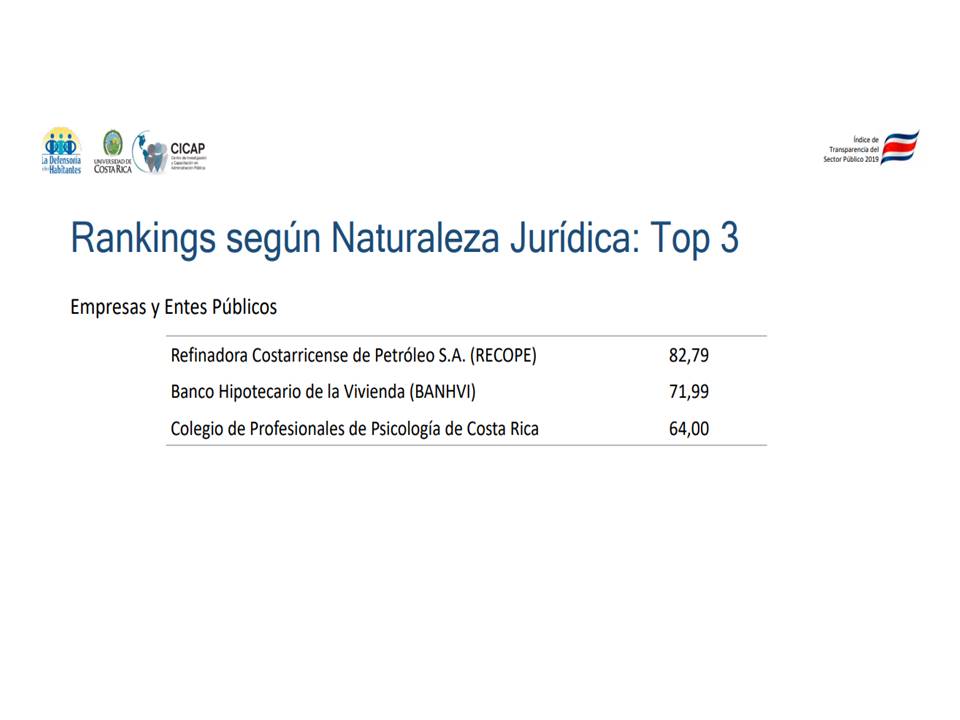 RECOPE lidera por tercer año consecutivo el top 3 de la categoría Empresas y Entes Públicos del Índice de Transparencia del Sector Público (ITSP) 2019, con una calificación de 82,79 puntos; seguido por el Banco Hipotecario de la Vivienda (BANHVI) y el Colegio de Profesionales de Psicología de Costa Rica.