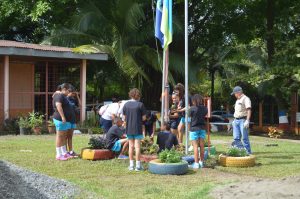 Las flores de diversos tipos se ubicaron bajo la asta donde están las banderas, entre ellas la de Bandera Azul Ecológica. También se eliminaron sepas muy crecidas de plantas para mejorar el paso hacia la de las canchas deportivas y áreas de recreo, las cuales dan al pasillo principal, y finalmente, al fondo, se trabajó en la siembra de la huerta con plantas y semillas de albahaca, culantro y orégano entre otras, utilizando las llantas aportadas por RECOPE.