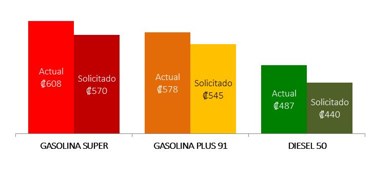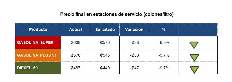 El litro de Gasolina Súper pasaría de ₡608 a ₡570 para una rebaja de ₡38, el litro la Gasolina Plus 91 de ₡578 a ₡545 para una disminución de ₡33, y  el litro de Diésel disminuiría de ₡487 a ₡440 para una rebaja de ₡47.