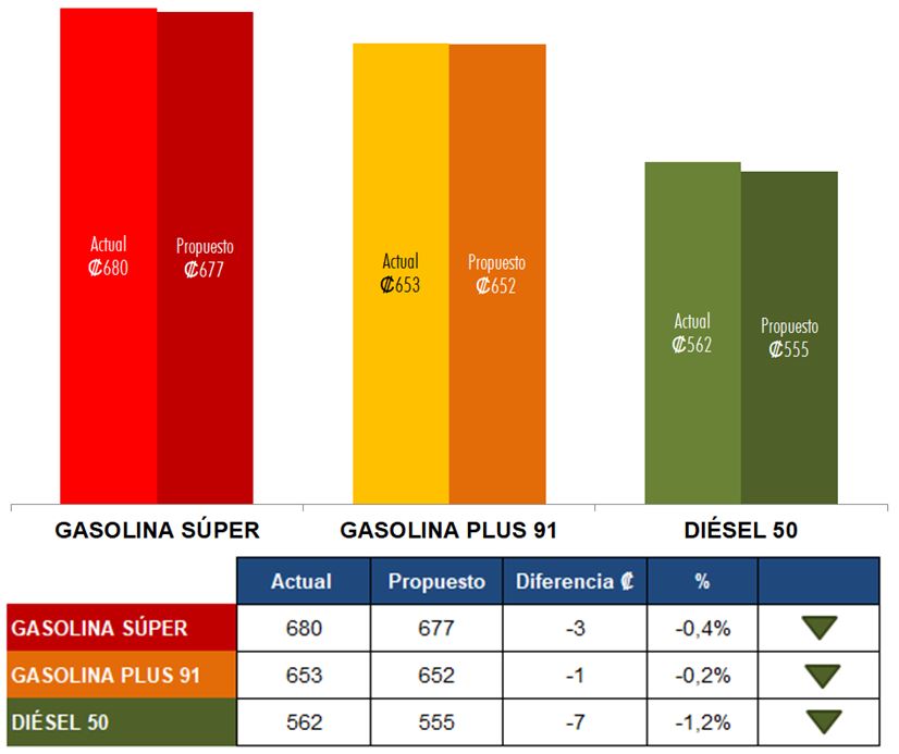 Lo solicitado conllevaría a las siguientes variaciones para el  consumidor final: el litro de gasolina Súper pasaría de ₡680 a ₡677 para una rebaja de ₡3, el litro la gasolina Plus 91 de ₡653 a ₡652 para una rebaja de ₡1, y  el litro de diésel de ₡562 a ₡555 para una rebaja de ₡7 .