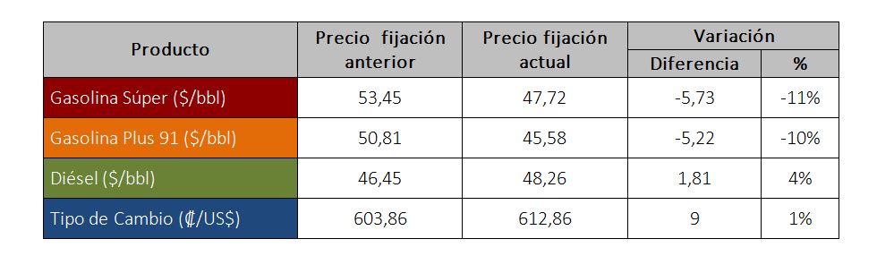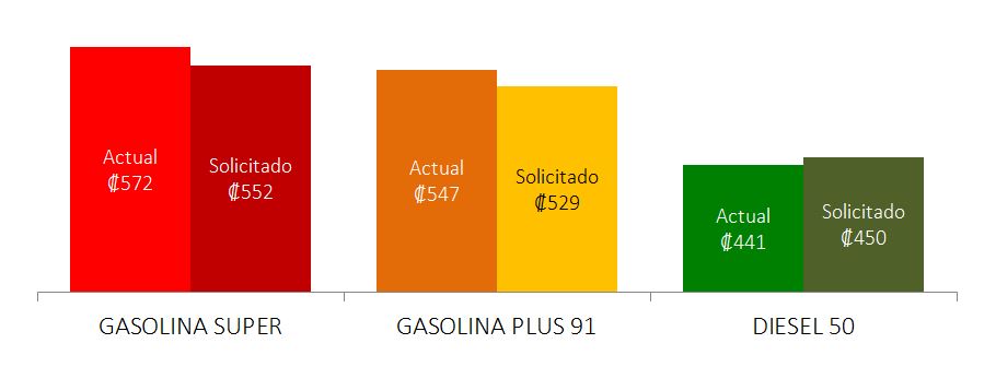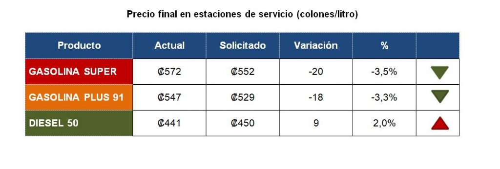 El litro de Gasolina Súper pasaría de ₡572 a ₡552 para una rebaja de ₡20, el litro la Gasolina Plus 91 de ₡547 a ₡529 para una disminución de ₡18, y el litro de Diésel variará de ₡441 a ₡450 para un incremento de ₡9.