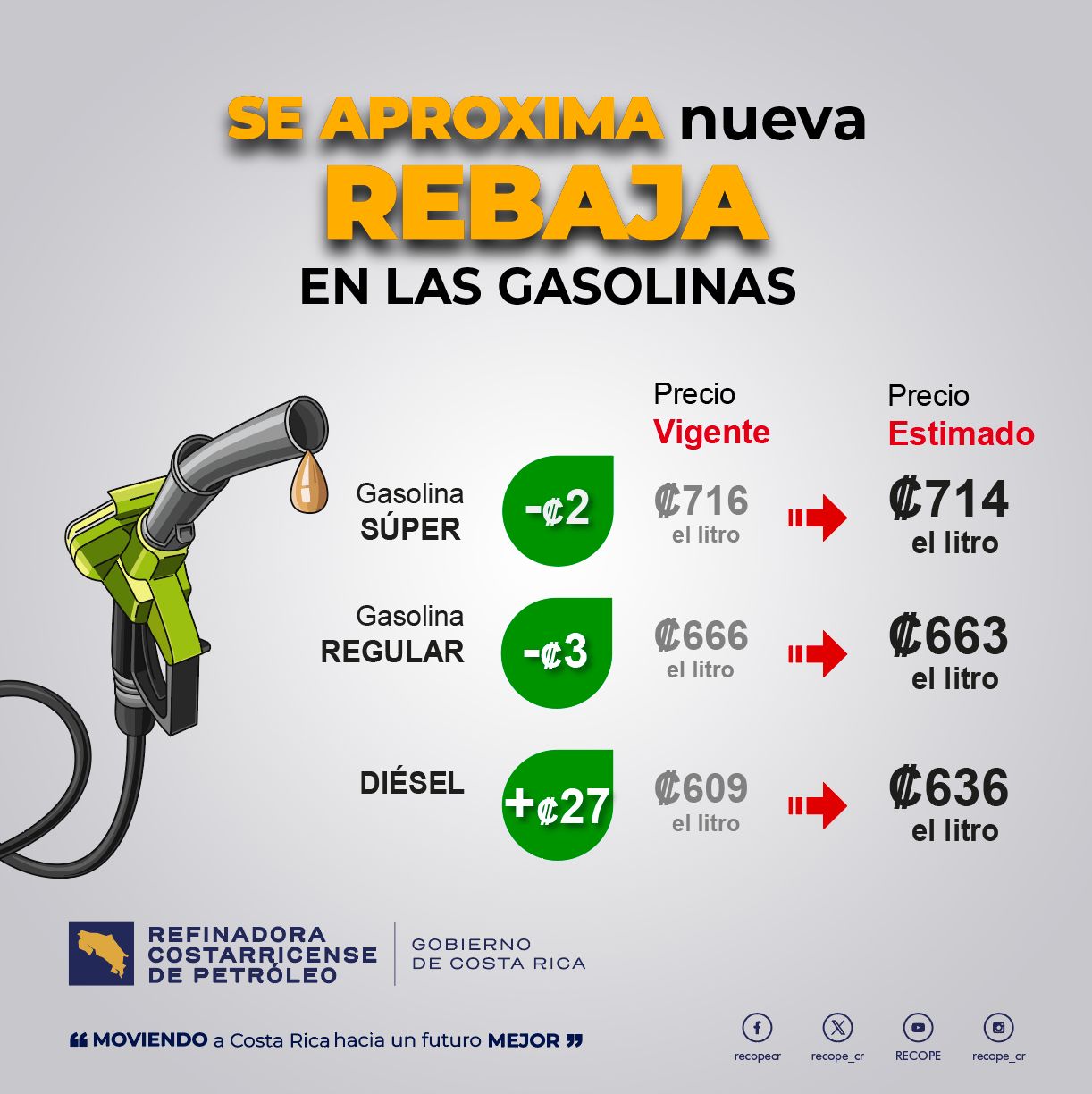 Preliminarmente, se espera que la gasolina súper pase de ₡716 a ₡714 por litro (–2) y la regular de ₡666 a ₡663 (-3).