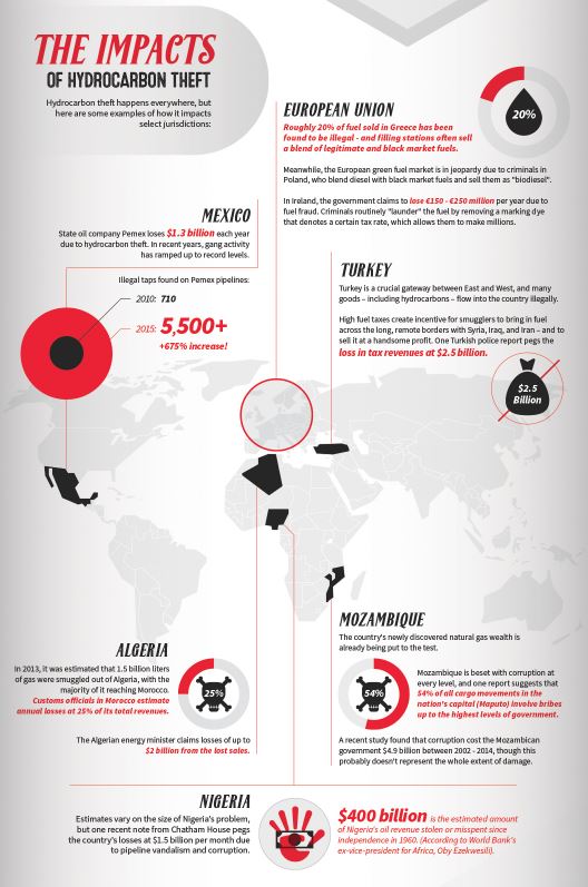 Esta forma de actividad delictiva ha generado un enorme mercado negro en el mundo. El robo, la adulteración y los fraudes relacionados con hidrocarburos y gas generan unos US$133.000 millones al año, según un estudio divulgado por la universidad de Yale en el 2019. (https://archive-yaleglobal.yale.edu/content/worlds-most-dangerous-black-markets).