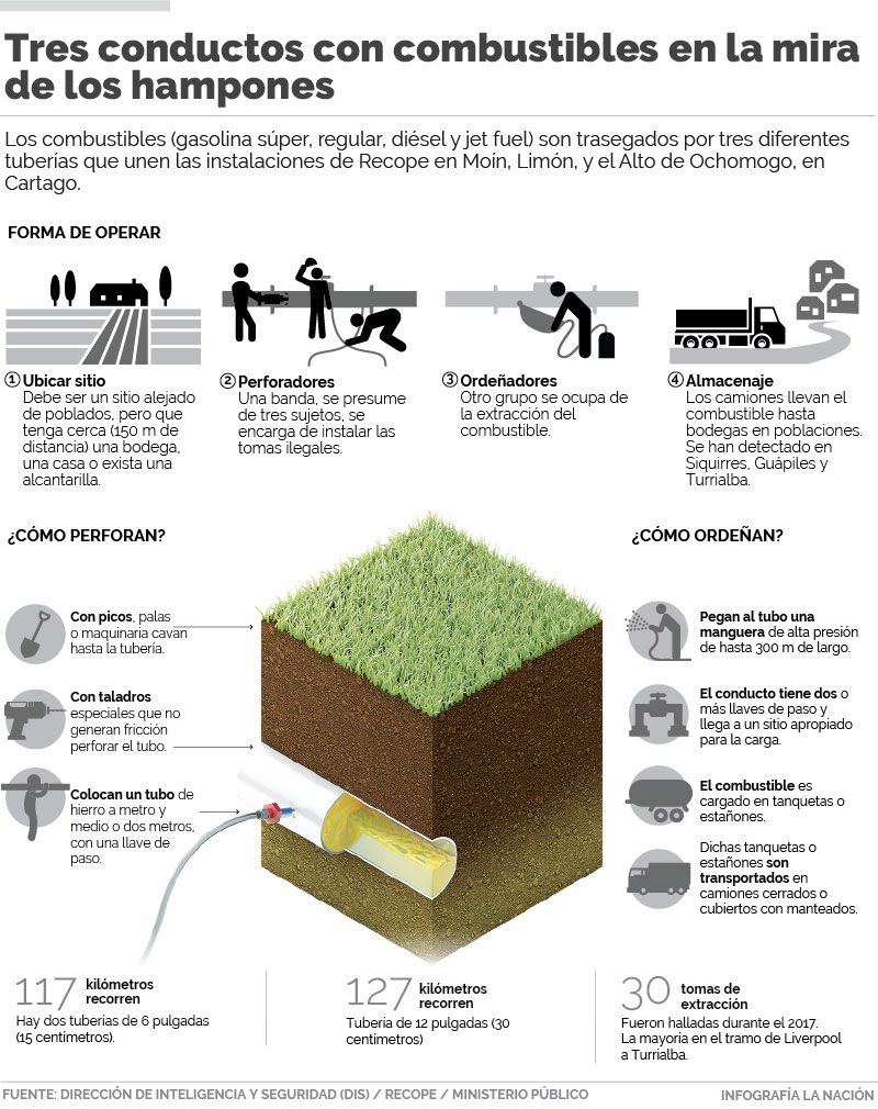 La Nación informaba en en 2018 que almenos 10 bandas participaban en la actividd del robo de combustible en Costa Rica.