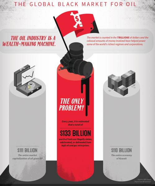 Esta forma de actividad delictiva ha generado un enorme mercado negro en el mundo. El robo, la adulteración y los fraudes relacionados con hidrocarburos y gas generan unos US$133.000 millones al año, según un estudio divulgado por la universidad de Yale en el 2019. (https://archive-yaleglobal.yale.edu/content/worlds-most-dangerous-black-markets).