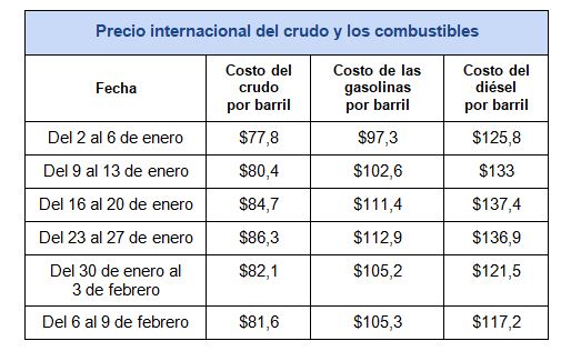 Durante este periodo se identifica que el precio internacional de los combustibles aumentó respecto a los mostrados en el mes de enero, tal y como se detalle en la siguiente tabla: